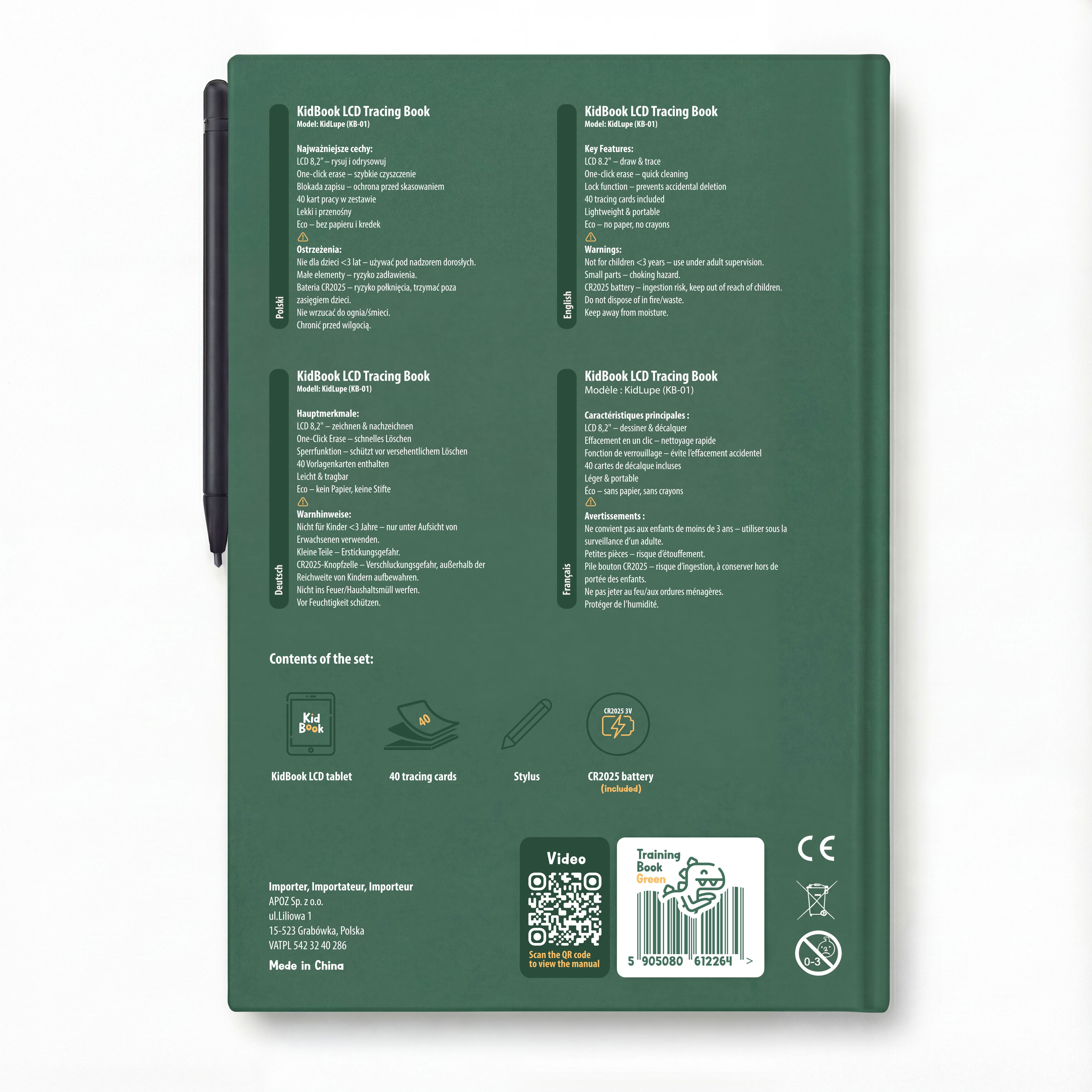 W zestawie otrzymujesz książeczkę z tabletem LCD do rysowania, rysik, baterię oraz 20 dwustronnych kart pracy (łącznie 40 stron ćwiczeń) do nauki pisania i rysowania.